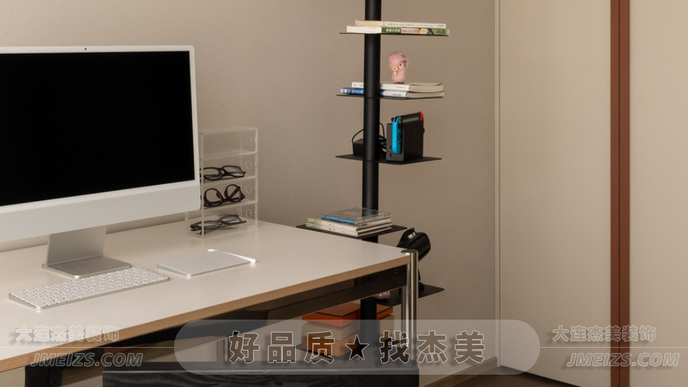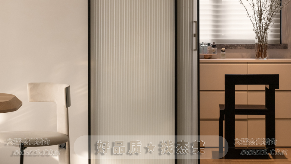 在廚房一側(cè),杰美裝飾設(shè)計師設(shè)計了一個小型步入式衣帽間,外側(cè)采用長虹玻璃幽靈門,確??臻g寬敞通透。內(nèi)部的兩側(cè)墻面用作衣柜,中間臨窗區(qū)域的抽屜柜兼具梳妝臺功能,百葉簾引入朗朗的日光,讓空間流露出時尚現(xiàn)代的感覺。