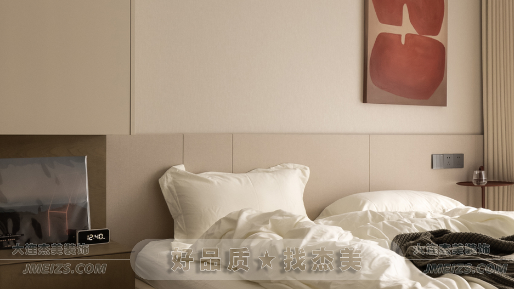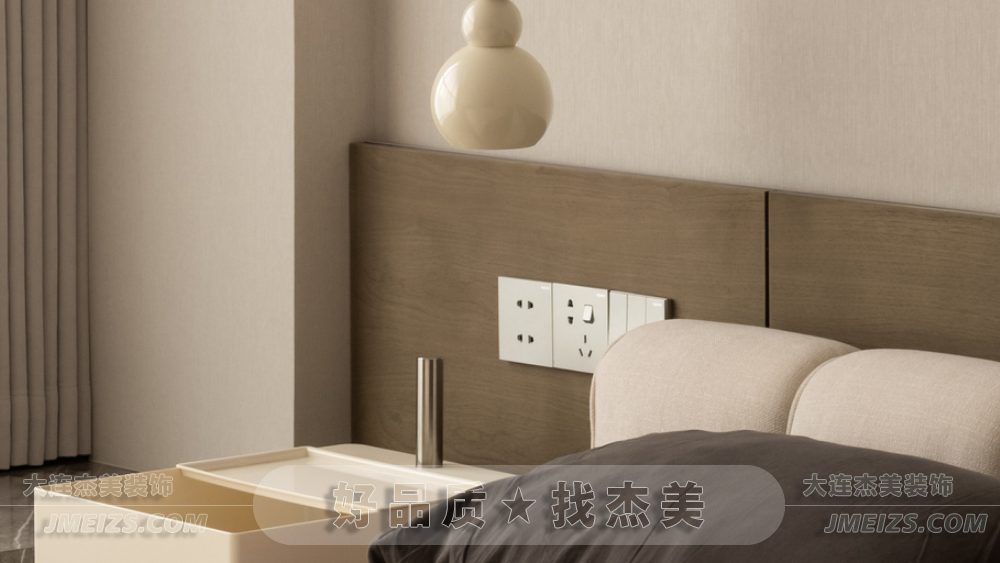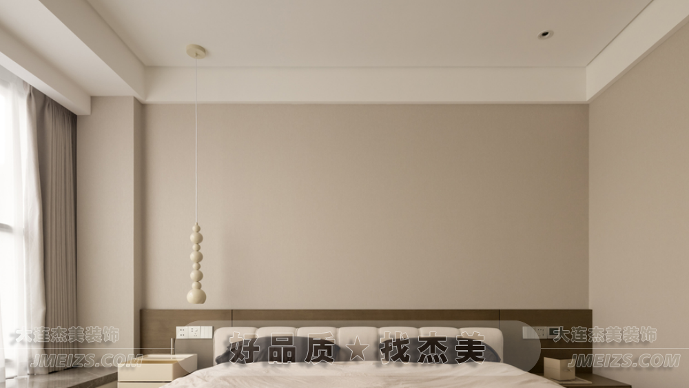 主臥室溫馨純凈,以奶茶色和淡雅白色為基調(diào),營造簡約色系的寧靜治愈感。床頭背后采用原木飾面板,展現(xiàn)現(xiàn)代主義下的自然美學(xué)。