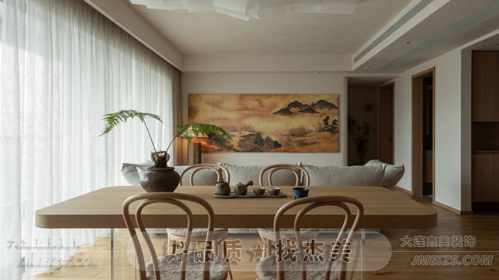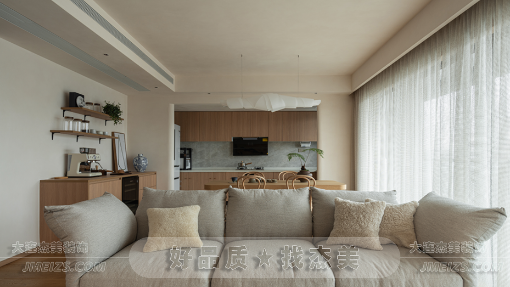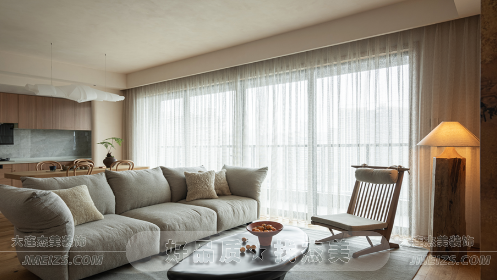 客廳的設(shè)計(jì)靈感來(lái)源于日式的禪意和自然。一體化的開放式客餐廳,雖然與傳統(tǒng)日式有所不同,但卻更加空靈和寧?kù)o。