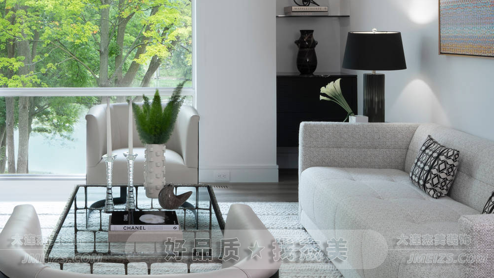 大大的落地窗,遠(yuǎn)處綠樹掩映,休閑空間整體明亮通透,輕松明快。