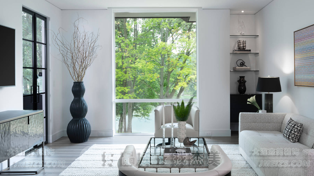 純白色墻面與深色實(shí)木地板形成強(qiáng)烈的視覺反差,簡潔大氣同時(shí)帶來質(zhì)感層次。超大面積的落地窗擴(kuò)大了室內(nèi)空間感,連接室內(nèi)外。