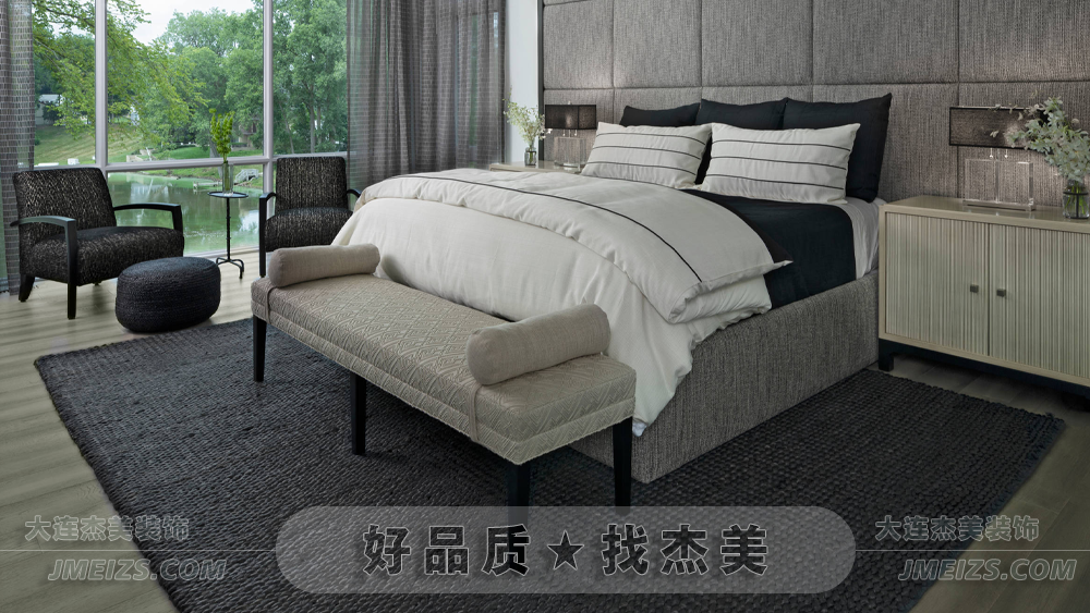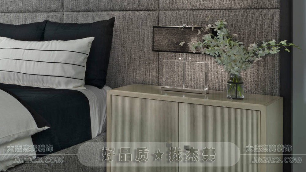 深灰色床體與白色床品色彩對(duì)比明顯,柔軟舒適的床上用品確保睡眠質(zhì)量。兩側(cè)床頭柜完整布置,考慮實(shí)用性。