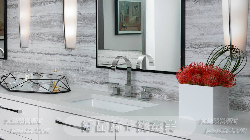 大面鏡擴(kuò)大空間感,帶來明亮照明效果。金屬質(zhì)感水龍頭與自然紋理灰色石材洗面盆契合簡約風(fēng)格。