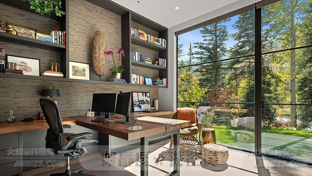 這個書房是一個與大自然和諧共生的空間,它讓人感覺寧靜、舒適,也充滿了知識和創(chuàng)造力的氛圍。