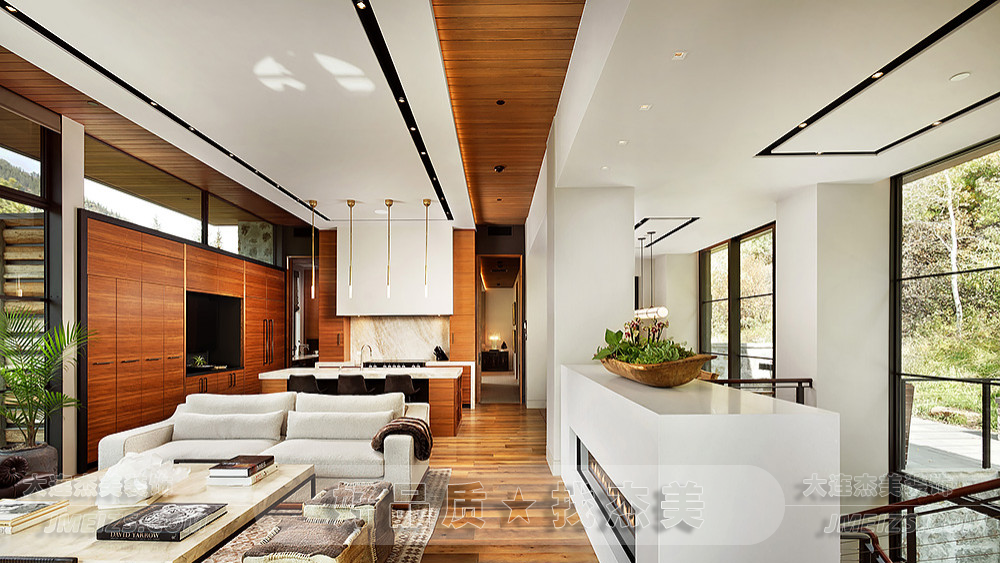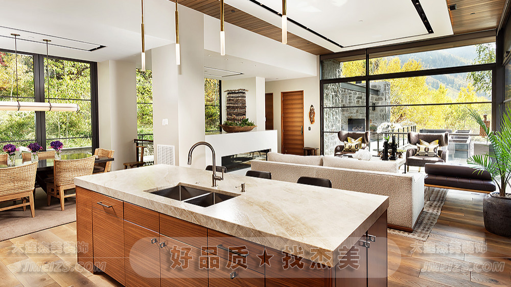 這個(gè)開放式廚房是一個(gè)完美融合了現(xiàn)代設(shè)計(jì)和自然美景的空間。