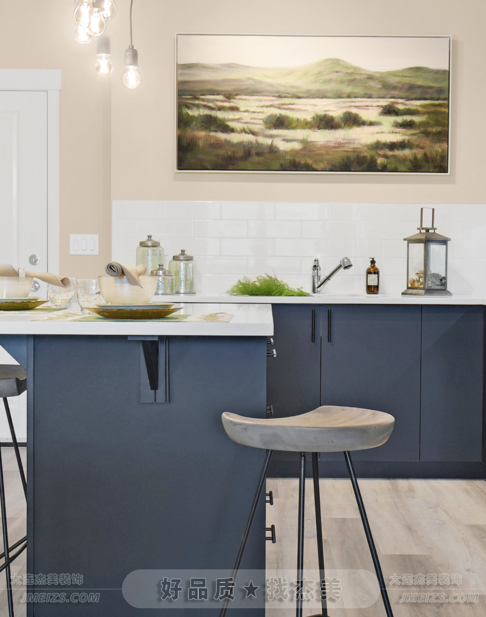 墻上的一副自然風(fēng)景圖為整個(gè)廚房增添了一份生機(jī)和活力。