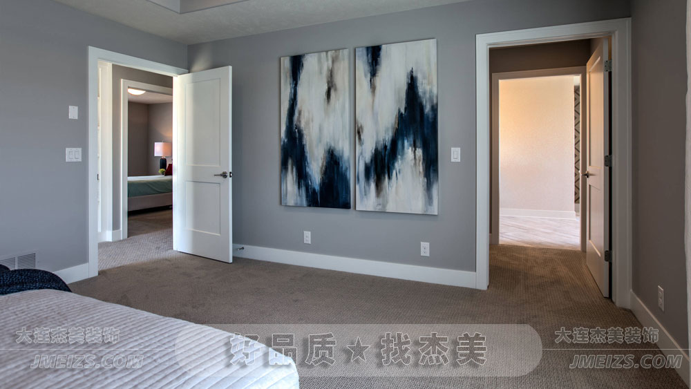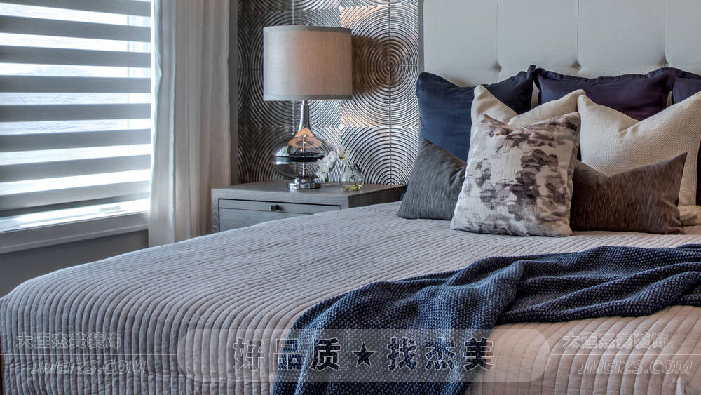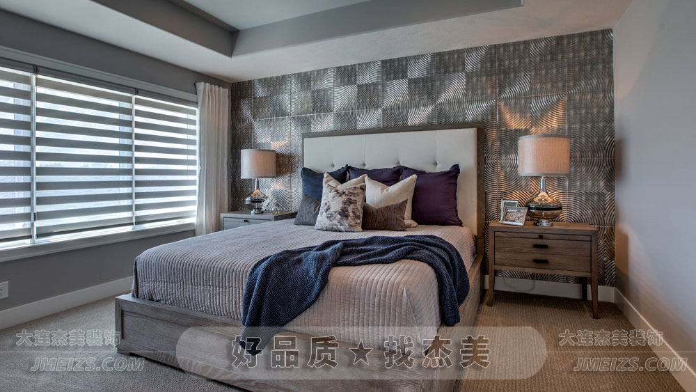 臥室的主體色調(diào)以淡雅的灰色和白色為主,這種顏色組合既顯得高雅又不失溫馨。淡灰色給人一種寧靜的感覺,而白色則增添了一絲純凈與奢華,使整個空間顯得既簡約又不失高貴。