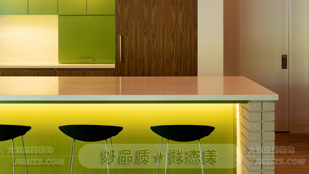 廚房島臺(tái)以其簡(jiǎn)潔的白色和綠色的櫥柜門,為空間帶來了一抹生機(jī)勃勃的色彩。