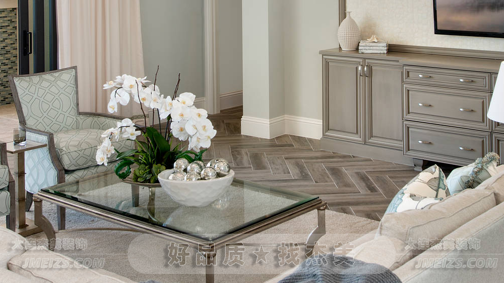 地面上的木紋地板以其古典的魚骨拼接圖案,